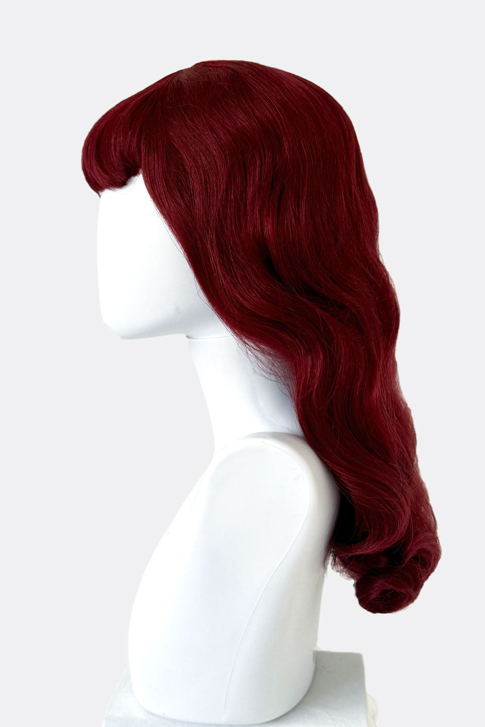 Une belle et longue perruque rouge cuivrée et rouge cerise avec une frange courte et des cheveux descendant jusqu'aux épaules. Style pin-up des années 50.